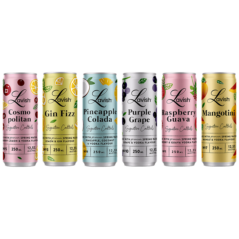 Eem mix van verschillende fruitige hoogwaardige Lavish cocktail pre-mix drinks.